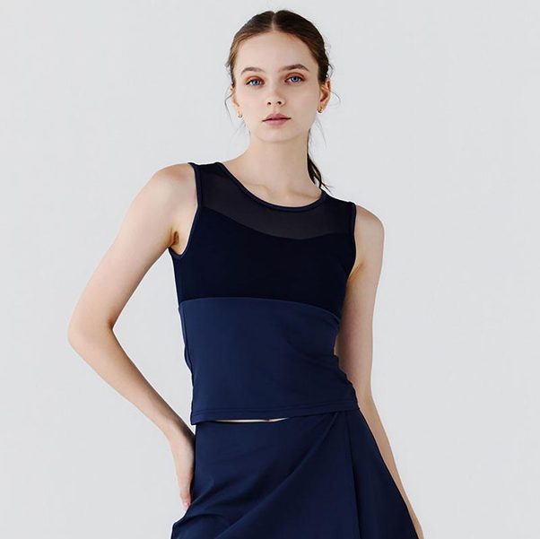 バストからデコルテにかけて、チュール素材を重ねたデザインタンクトップ。