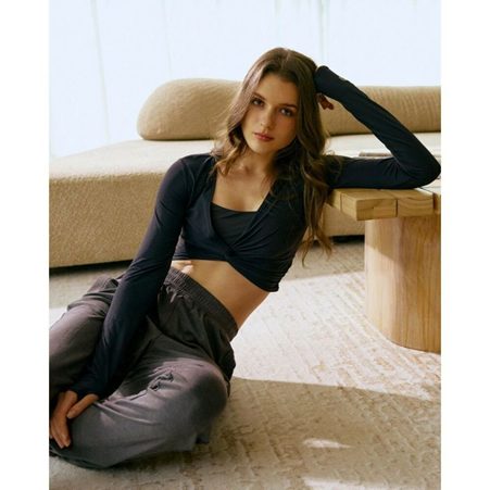 ウエストラインを美しく見せる、ツイストデザインが特徴のロングスリーブトップス。