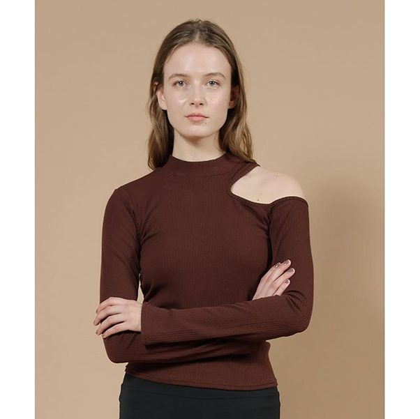 モックネック+左肩の肌見せデザインで、モードな雰囲気が漂います。